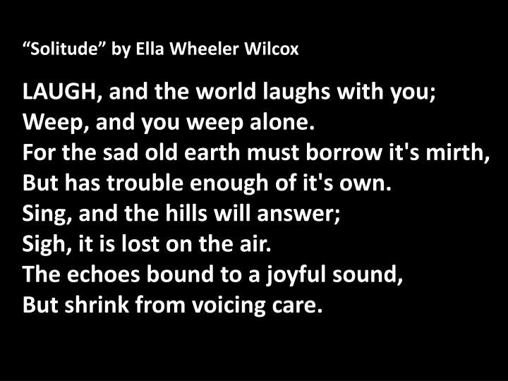 The poem is telling about the relationship between the individual and the outside world. She also dramatized the tension between being positive and negative attitude. This sounds a little bit complicated for you to understand. Let me make it short. What I’m trying to say that, Ella trying to tell people to keep optimistic. She tells us that if we follow and listen to negative vibes around us it will affect our life. Take a look at her first line. Laugh and the world laugh with you. She is trying to say that if we keep on being optimistic, the world will follow us. If we keep on being weep, you will weep alone. That’s so obvious. Don’t be weep but have a joyful life.